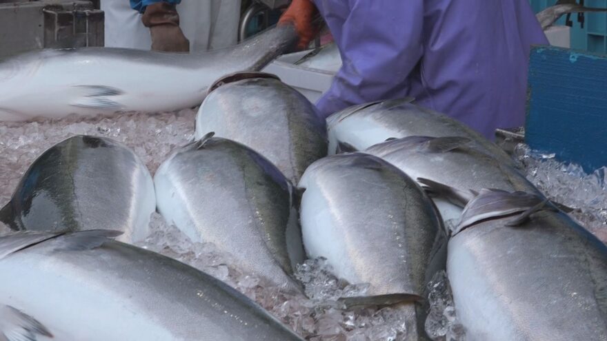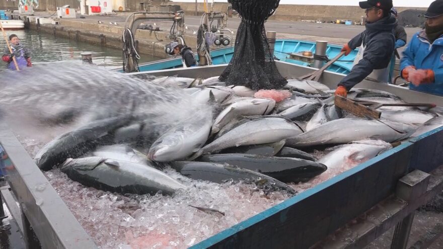 漁港では、水揚げされたブリを漁師たちが大きさごとに選別していきました。