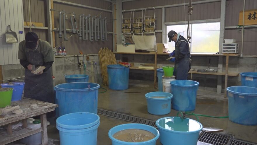 クズ作りは今が最盛期で、熊川葛振興会のメンバーが、冷え込む冬場に行われる寒ざらし作業に精を出しています。