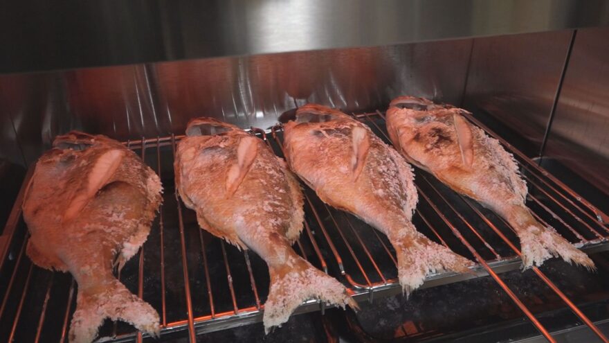 グリルでじっくり焼き上げているのは市のブランド魚・敦賀真鯛。敦賀真鯛が育つ敦賀湾は1年を通して水温の寒暖差が大きいため身の締まりが良く、味が濃いのが特長です。新春の縁起物として多くの注文を受ける中村旅館では年の瀬のいまがまさに出荷のピーク。年末までに約200匹を焼き上げ、県内を中心に出荷するということです。