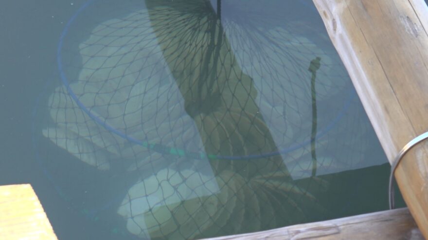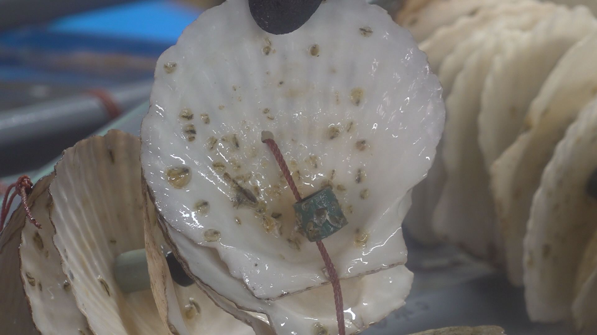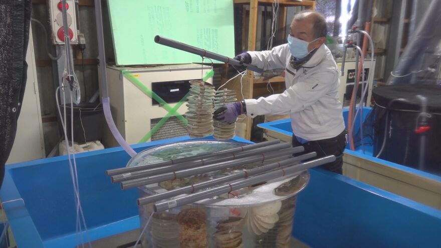 2025度、量産化に成功し,初めて市内の養殖業者へ2万個が出荷されました。順調に生育すれば秋ごろに水揚げできます。県立大学では来年は10万個の出荷を目指しています。