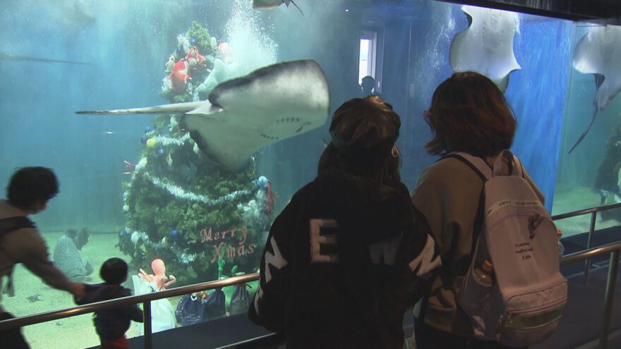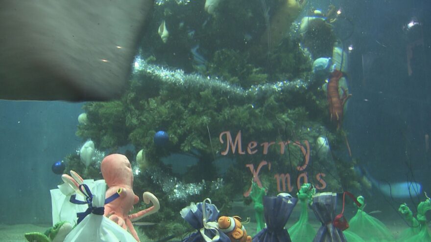 クリスマスツリーの設置は12月25日までで、土日祝日には正午から30分間、水中サンタと記念撮影ができます。