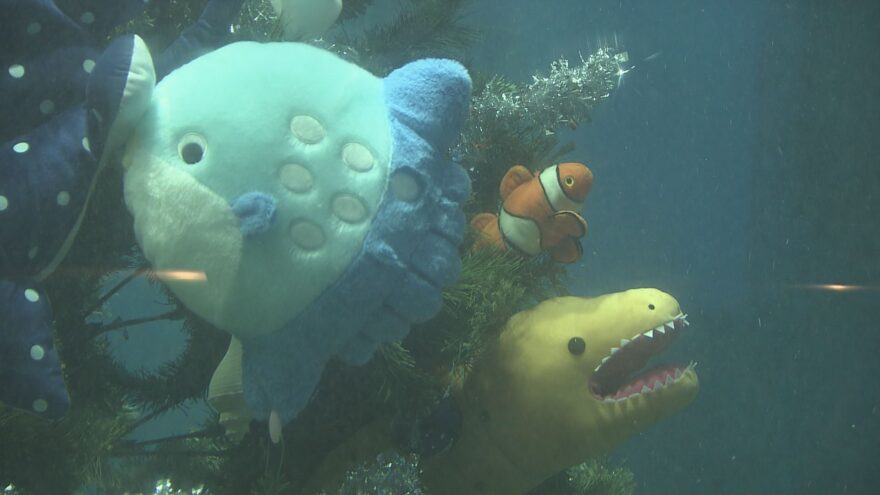 飾り付けるのは水中サンタとトナカイで、今年は20個以上のぬいぐるみを飾った楽しさ溢れるツリーに仕上がりました。